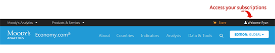 All other Moody’s Analytics subscriptions available through www.economy.com (such as the Data Buffet and Précis reports) can be accessed through the “My Subscriptions” page via the user profile link at the top right of the website. This replaces the “My Economy” link previously found on the site. All bookmarked urls will be unaffected.